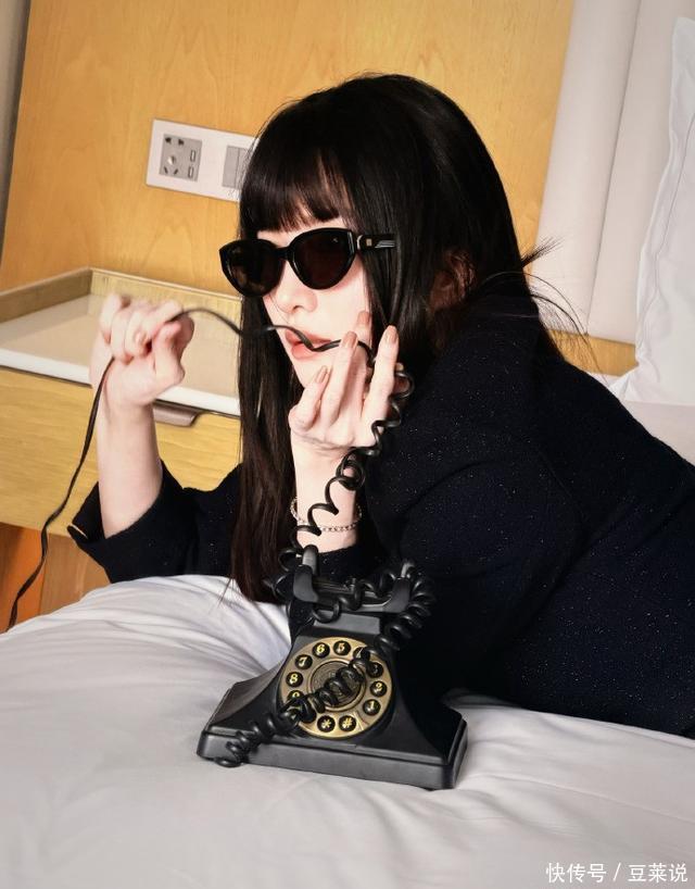 这张艺术照片是她趴在一个床上,手里还拿着一个老式的电话,不过一看这就是影楼的拍摄道具, 她的眼上还戴着一副墨镜,给人一种酷酷的感觉,这组照片和她之前的风格真是完全不一样的感觉。