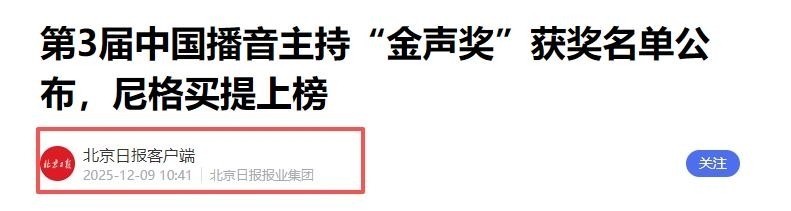 74. 2024年12月9日,尼格买提荣获第三届中国播音主持“金声奖”优秀电视播音员主持人称号。